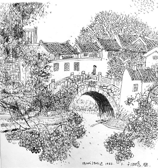 金龙桥 小桥流水人家,绿树朱门黛瓦。 小舟横卧湖边,水上藤蔓有花。 画中小桥名为金龙桥,位于城东南隅内城湖上。相传,包公下陈州,查明国舅王逵坑民害民罪状,铡国舅于此桥上。 此作品创作于1966年。