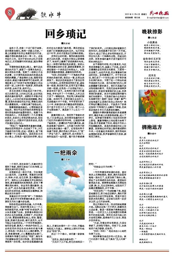 “到站了!”随着售票员善意的提醒,我被拉回到现实中,仓促地下了车。大巴又继续它的行程,泛起一团黄土,留下我孤零零一个人站在路口。独自走在乡间的小路上,四周是一望无际的田野,经过的村庄也大都是门庭冷落,偶见老妪坐在家门口剥着黄灿灿的玉米。也只有在这个时节,农村才呈现出它安静的面貌。