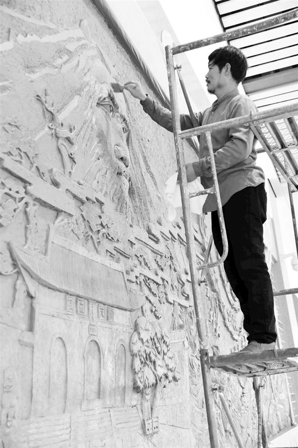 11月6日上午,随着雕塑家们做完最后一道钴银颜料工序,郑阜高铁周口东站三楼候车厅东墙壁上的两个巨型浮雕完工。据了解,这两个巨幅浮雕是由周口籍青年雕塑家邵辉、田海军、张鑫叶历时两个月创作完成。