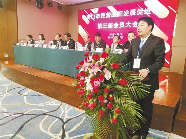 11月9日上午,周口市民营医院发展促进会举行第三届换届选举大会,选举产生了新一届领导班子,周口协和骨科医院张志平院长连任会长。图为张志平当选后作表态发言。记者 李伟 摄
