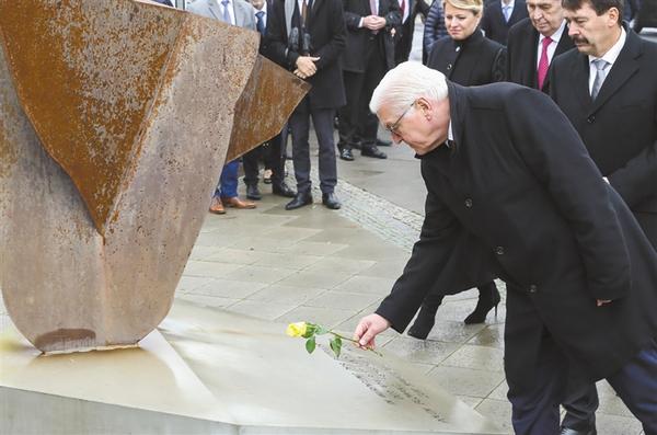 11月9日,在德国首都柏林,德国总统施泰因迈尔(前)在柏林墙倒塌30周年纪念活动中献花。