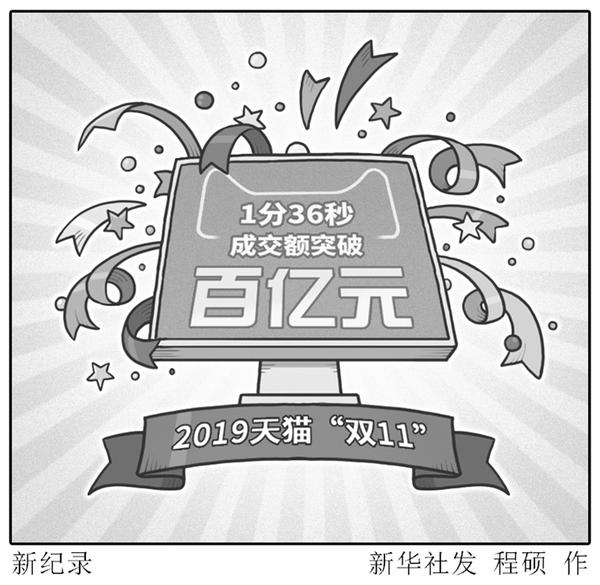 零点钟声刚过去1分36秒,2019天猫“双11”成交额已突破100亿元人民币。2018年达到这一数字的时间为2分05秒。
