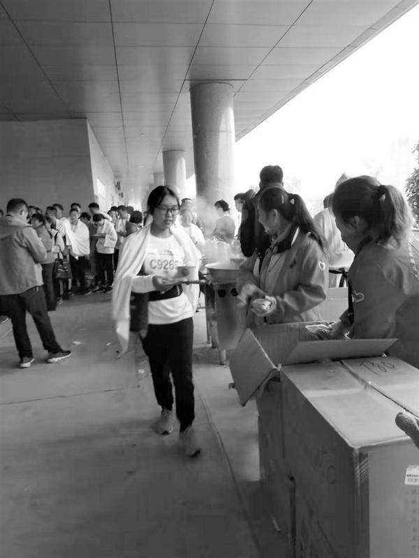 当参赛选手跑完马拉松,在市体育中心的志愿者为他们发放胡辣汤、姜汤等(如图)。