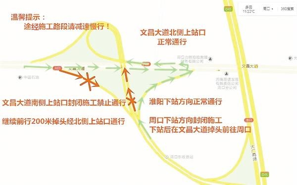 车辆从文昌大道怎样才能进入大广高速呢?从大广高速周口东站下道进入市区又该怎么行驶呢?对此,市公安局交通管理支队相关负责人介绍,文昌大道自西往东方向需转大广高速车辆,请通过施工路段后继续前行200米后掉头,从文昌大道北半幅入口转入大广高速;从周口东站下道需往周口市区方向车辆请按标牌提示,从淮阳方向下道至文昌大道50米后掉头,从文昌大道北半幅东向西方向去周口市区。