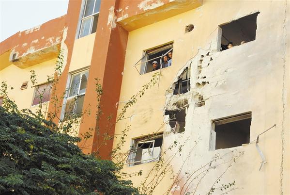 11月20日,在叙利亚大马士革,人们站在受损建筑内。