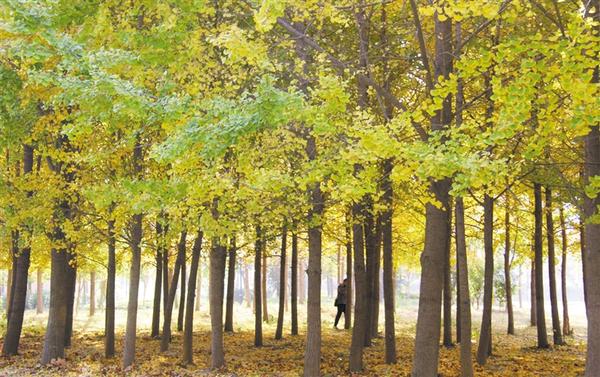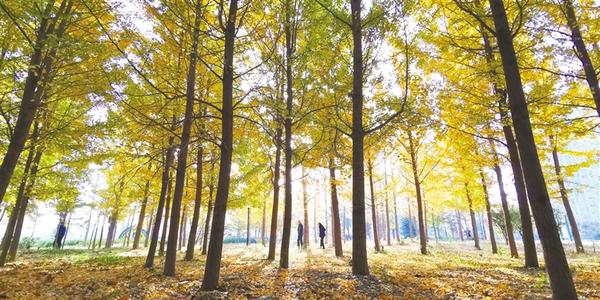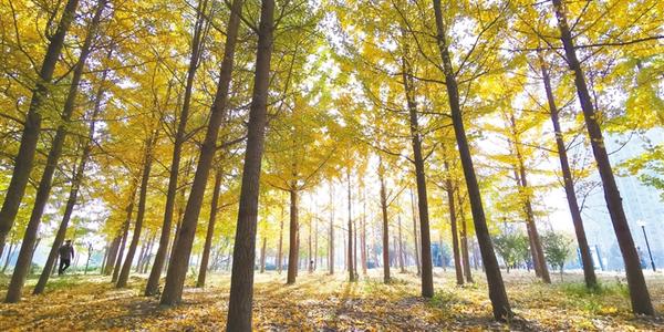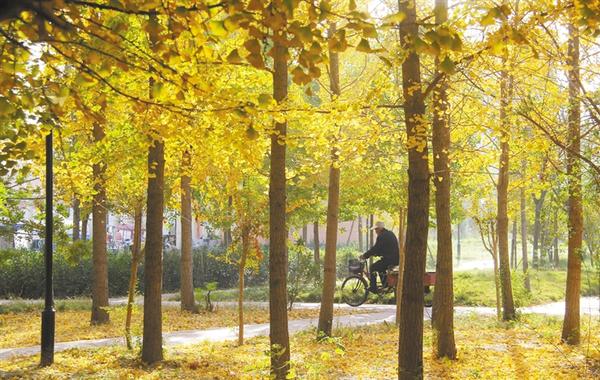 近日,市经济开发区人民广场,金黄色的杨树叶在阳光照耀下熠熠生辉,给城市增添一抹亮色。张振海 摄