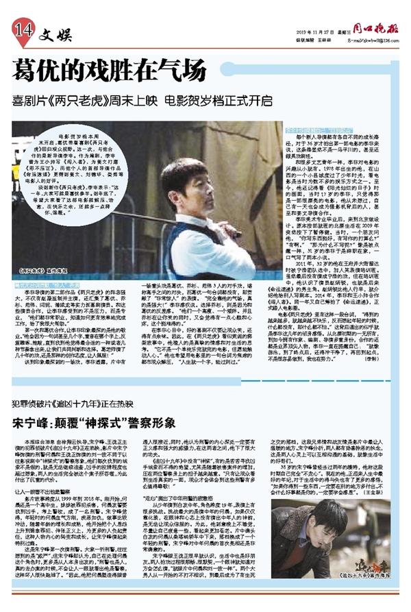 电影贺岁档本周末开启,葛优带着喜剧《两只老虎》回归观众视野。这一次,与他合作的是新导演李非。作为编剧,李非曾为王小帅写《闯入者》,为姜文打磨《邪不压正》,而他个人的首部导演作品《命运速递》更得到姜文、刘德华、娄烨等电影人的好评。