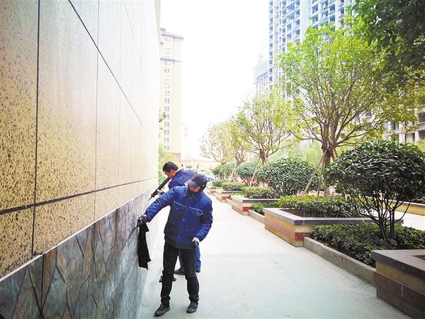 连日来,周口市城乡一体化示范区馨丽康城小区,为了进一步做好“创卫”迎检工作,投入人力 、财力美化小区的楼体和相关设施,为“创卫”工作添彩,同时让小区业主的生活环境得到进一步提升。图为工人为小区墙体镶嵌文化石瓷砖。 记者 李国阁 摄