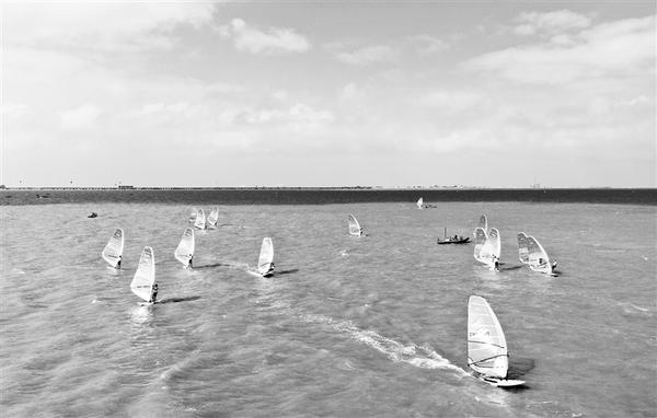 11月27日,选手在RS:X级帆板比赛中(无人机拍摄)。