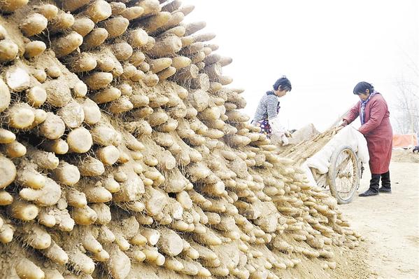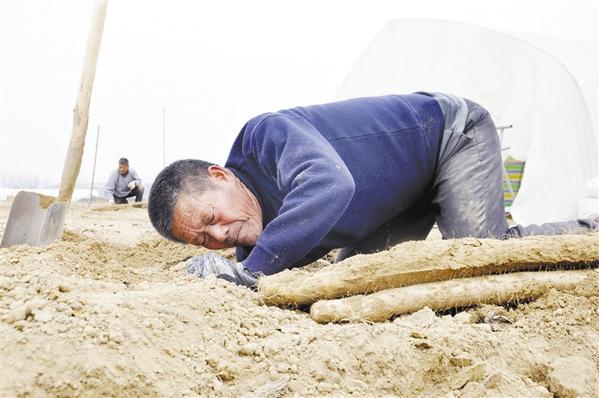 山药的连片规模化种植,也催生出一个特殊工种——挖山药职业人。每到山药收获的季节,一群专职挖山药工人就会出现在田野里,或蹲,或站,或跪,或趴,拿着特制钢锹,在土壤里“刨金”。