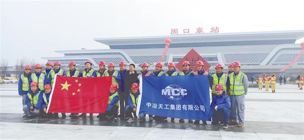 在这些人中,有一群身穿蓝色工装、头戴红色安全帽的人员 ,他们“组团”来到周口东站站前广场,手持国旗和一面写有“中冶天工集团有限公司”字样的旗帜合影留念。