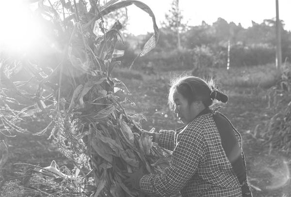 石林县清水塘村农户迎着朝阳劳作(11月30日摄)。迎着初冬清晨的朝阳,云南省石林县清水塘村的农户抓紧晾晒收获的玉米。 新华社记者 兰红光 摄