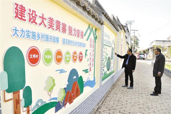 昨日,两位村民在商水县黄寨镇曾楼村观看文化墙。