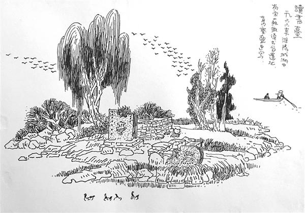 宛丘先生即苏辙子由,因受苏轼株连,被贬为陈州教喻。苏辙在陈期间,于城北柳湖中之高地筑一书屋,读书自修,以向其道,后人为纪念他,在此修亭筑碑,名曰苏子由读书台,如今早已亭毁碑裂,作者写生时只剩一堆破砖烂石了。