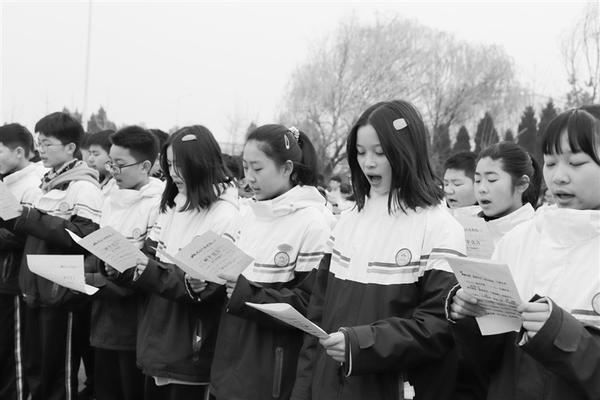 12月13日,时逢第六个南京大屠杀死难者国家公祭日,周口天立学校全体师生在该校操场集会,恭祭30万名遇难儿女。图为该校全体师生集体诵读《和平宣言》。