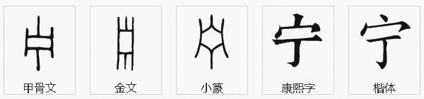 “宁”字,繁体为“寧”,是个形声兼会意字。“寧”字上边是“宀”,代表房子;中间的“皿”代表器皿,古代的器皿都较厚重,表示稳重、安宁的意思;下边的“丁”字是声符,表示“宁”的读音。“宁”“丁”古为一音之转,即读音相同或相近。后来则在“皿”上面加个“心”字,仍为表意部分,“心安”则“宁静”,故宁的本意为宁静、安宁、稳重。