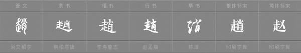 繁体“趙”在六书中属形声字,从走,肖声。趙、肖古为一音之转。从走,走,在古代是跑的意思。《狐假虎威》中“虎求百兽而食之……兽见之皆走”,这里的“走”即是“跑”的意思。“走”字下面的“ ”字是个象形字,代表人的脚。“ ”字上面有个土字,表示跑时扬起尘土。“肖声”表示“趙”字读音为“肖”。“走”“肖”为趙,意为跑步、快走、疾行。
