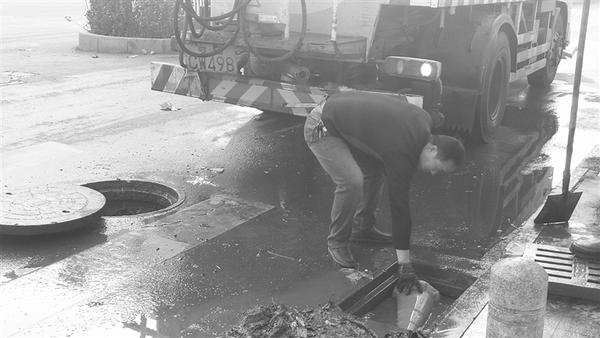 12月22日是周日,在周口市中心城区庆丰路与周口大道交叉口,一位市政工作人员正在清理窨井内的垃圾,确保下水管道畅通。他们放弃休息,只为让市民的生活环境更美好。记者 关秋丽 摄