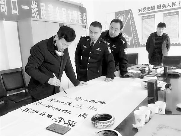 本报讯 12月26日,市文艺志愿服务中心组织我市6名知名书法家走进市公安局城北分局,以浓浓的墨香作为礼物,为寒冬里仍坚守在执勤一线的广大民警送去丰富的文化大餐。