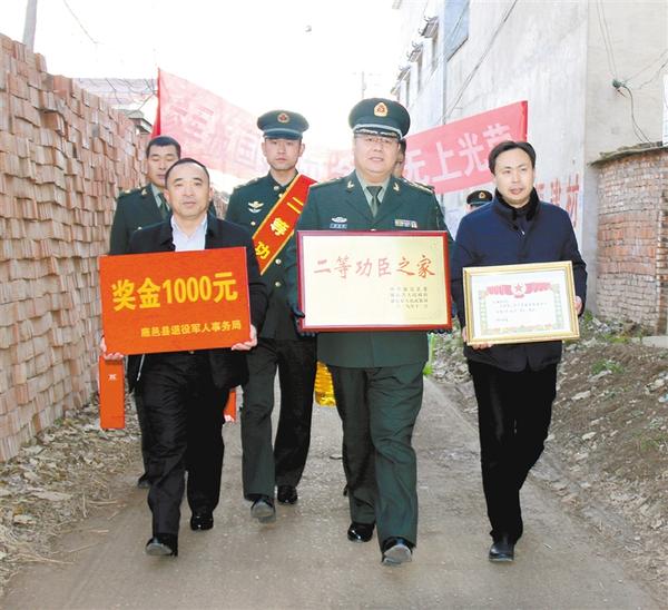 本报讯 12月30日上午,铿锵激越的锣鼓声在鹿邑县观堂镇龙庄村龙瑞祥家的院子里响起,院内洋溢着喜庆的气氛。鹿邑县县委常委、县人武部政委杜宝森带领县退役军人事务局和观堂镇党委、政府负责人及工作人员,高举“参军报国建功 全家无上光荣”的条幅,将二等功臣龙瑞祥的立功喜报和“二等功臣之家”牌匾、奖金、慰问品送到他家中(如图)。