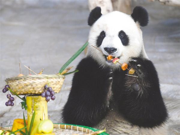 当日是2019年最后一天,海南热带野生动植物园的工作人员为园区内大熊猫“贡贡”“舜舜”准备了用葡萄、南瓜、竹笋等果蔬制作的“火锅串串香”,让它们用“撸串”的方式迎接新年的到来。 新华社记者 杨冠宇 摄