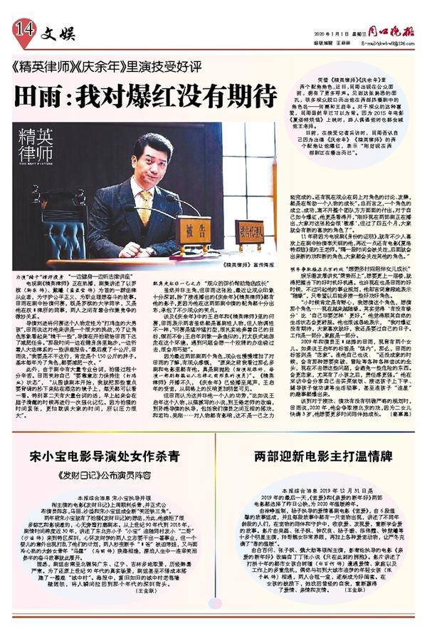 日前,在接受记者采访时,田雨否认自己因为出演《庆余年》《精英律师》的两个配角让他爆红,表示“刚好现在两部剧正在播出而已”。