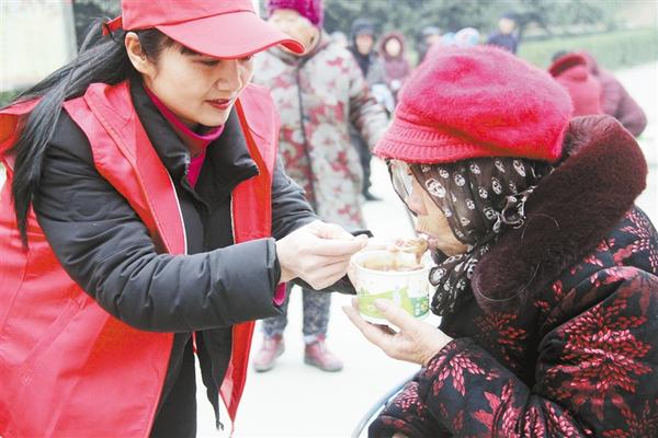 1月2日上午,周口市慈孝文化促进会巾帼志愿服务队的26名志愿者,在周口人民公园附近给55岁以上市民送去热气腾腾的腊八粥、面包和茶鸡蛋,让他们在腊八节当天享受到来自志愿者的周到服务。图为志愿者在喂老人喝粥。记者 张洪涛 摄