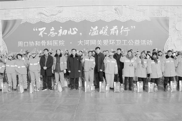 1月3日上午,由周口协和骨科医院联合大河网举行的“不忘初心 温暖前行”关爱环卫工人公益活动在五一文化广场举行。活动现场,周口协和骨科医院党支部书记刁庆勋和院长李军一起为我市100名优秀环卫工人代表发放现金、食用油、大米。环卫工人接到年货时,脸上露出了笑容。 记者 黄佳 摄