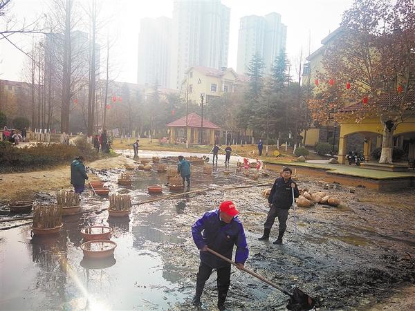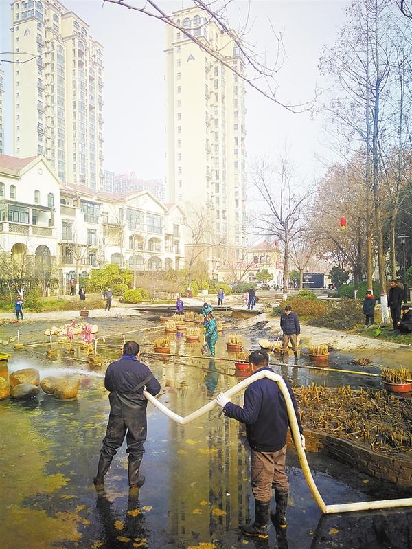 1月4日、5日,周口建业森林半岛物业人员对小区景观湖进行彻底清淤,更换碧水,同时进一步加大打扫卫生力度,美化亮化小区,以迎接2020年春节的到来,让业主度过一个干净卫生祥和的新春佳节。记者 李国阁 摄