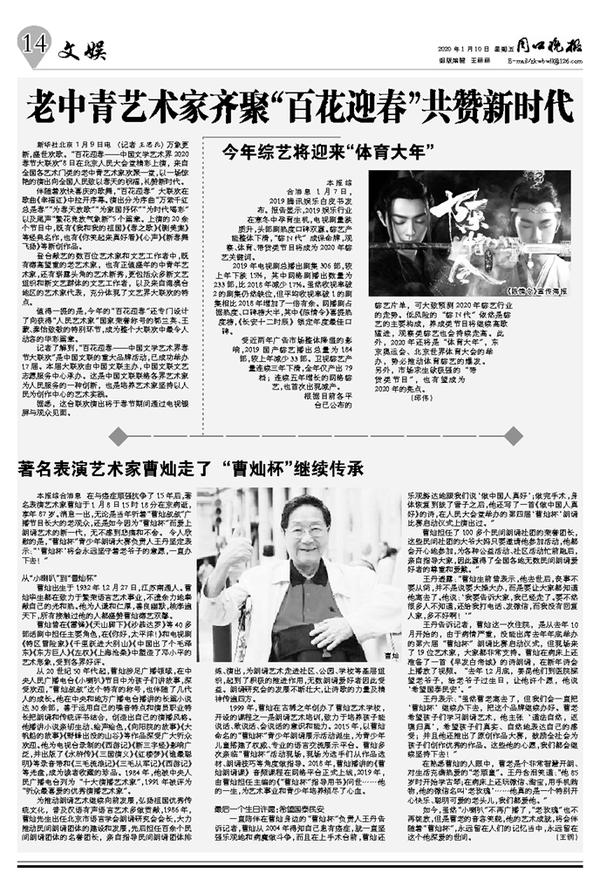 本报综合消息 在与癌症顽强抗争了15年后,著名表演艺术家曹灿于1月8日15时18分在京病逝,享年87岁。消息一出,无论是当年听着“曹灿叔叔”广播节目长大的老观众,还是如今因为“曹灿杯”而爱上朗诵艺术的新一代,无不感到悲痛和不舍。 令人欣慰的是,“曹灿杯”青少年朗诵大赛负责人王丹坚定表示:“‘曹灿杯’将会永远坚守着老爷子的意愿,一直办下去!”