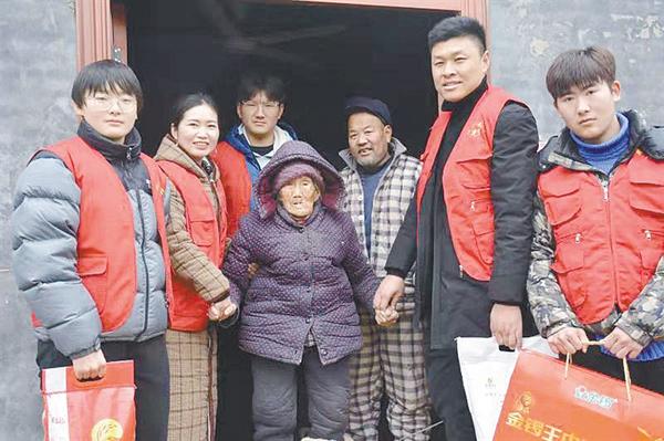 1月11日,住在商水县城东部的刘玉英早早起床,叫醒高中刚放假的儿子王景超以及与儿子临时一块住的、也正读高中的外甥胡涵,还有上中专的外甥李柏龙,把米面油等物品装上私家小车,穿上防滑鞋,披上红马甲,朝着10多公里外的乡村出发……