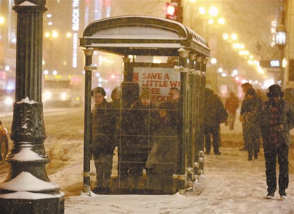 1月17日,在美国芝加哥,人们在雪中等待公共汽车。
