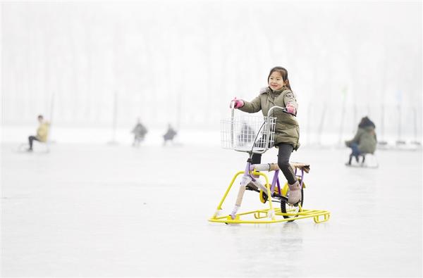 1月18日,一名女孩在冰场上体验冰上自行车。