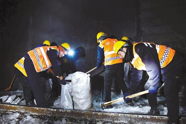 为充分利用无列车运行的除冰作业“天窗期”,工人们在隧道里面一刻也不敢停歇,冒着零下十多摄氏度的低温紧张工作。到午饭时间,就随便吃点榨菜、馒头、泡面等充饥。破冰、运冰、撒盐,这些工作繁琐而艰苦,工人的手套都因为不间断接触冰块而被凉水浸透。一天的紧张工作后,大家匆匆将工具装车,在颠簸的路面上乘车四五个小时回到驻地。新华社记者 张龙 摄