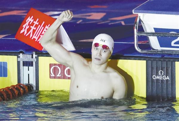 1月19日,孙杨庆祝夺冠。