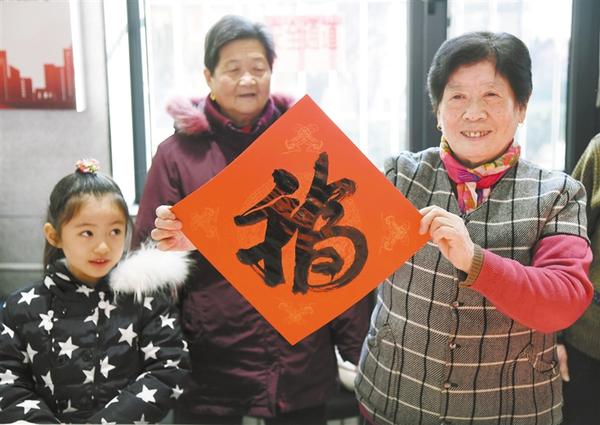 1月21日,参加活动的学院路街道居民在展示自己写的“福”字。