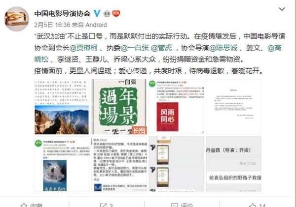 本报综合消息 2月5日,中国电影导演协会在微博上发文,文中写道:“武汉加油”不止是口号,而是默默付出的实际行动。中国电影导演协会副会长贾樟柯、执委管虎,协会导演陈思诚、姜文、高晓松、李继贤、王静儿、乔梁等心系大众,纷纷捐赠资金和急需物资。