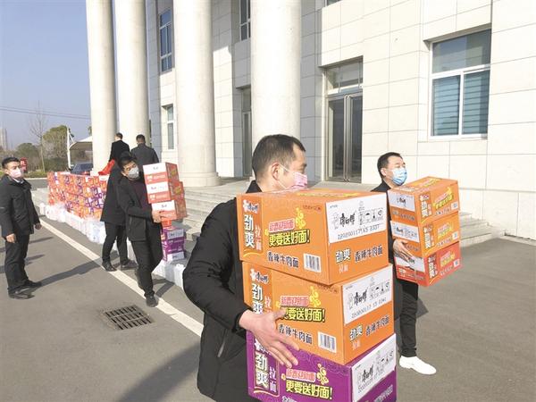 当日10时许,市城乡一体化示范区工商联、河南宏冠达汽车经销集团、向日葵爱心公益组织和理事企业把载满数辆车的物资送到市城乡一体化示范区(如图)。这些物资分别为100箱方便面、30件火腿肠、15个热水器、15个保温瓶、400斤消毒酒精、500斤84消毒液和2000个口罩。