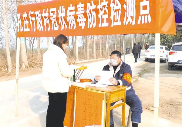 2月9日早上7点,双楼乡孔庄行政村的主干道上行人和车辆寥寥无几,村支书刘大峰拄着双拐,带着工作队员早早地来到疫情检测卡点值班,对行人和车辆进行体温检测和信息登记(右图)。自疫情开始,刘大峰每天如此,从早上7点到晚上11点全天都在卡点值班。
