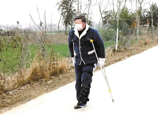 腿骨骨折,并没能阻止他防控疫情的脚步,一双拐杖、一辆三轮车成了他抗击疫情过程中最亲密的“战友”。宣传、排查、登记、检测,村里道路上留下了他深深的脚印,他用自己的实际行动为村民们筑起了一道坚实的防线,他就是郸城县双楼乡孔庄行政村党支部书记刘大峰。