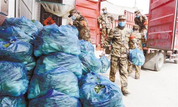 疫情防控期间,沈丘县人武部组织民兵应急队员成立送菜小分队,为封闭的社区义务送去新鲜蔬菜,既避免人员外出交叉感染危险,又极大地方便的群众生活。图为小分队正在为社区送菜。 曹新旺 摄