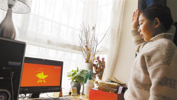 2月25日,周口市文昌小学三年级的一名学生在家中敬队礼、唱少先队队歌。自新冠肺炎疫情发生后,我市各小学通过网络授课方式,让孩子们停课不停学。当日,周口市文昌小学组织学生在网上观看“河南省少先队活动抗疫专题示范课”,让孩子们学到了很多关于新冠肺炎的相关知识。
