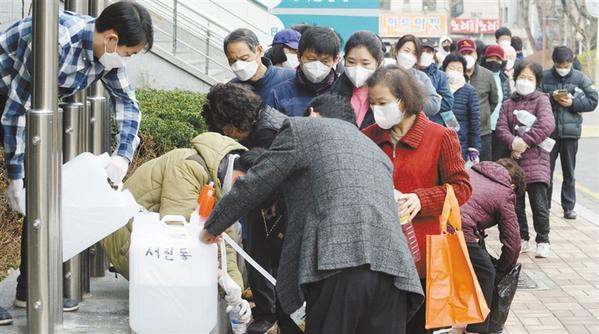 2月26日,在韩国全州,市民排队接取政府提供的消毒液。