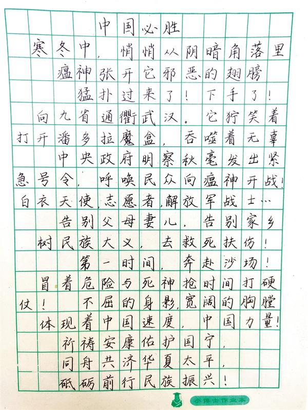 曾经羡慕别人能写一手好字的蒋智慧,拿出比别人更多的时间刻苦练习,进步也最快。看到作业上一个个醒目的“优” 字,她觉得这次疫情宅家练字,不仅充实了生活,还得到了丰厚回馈。