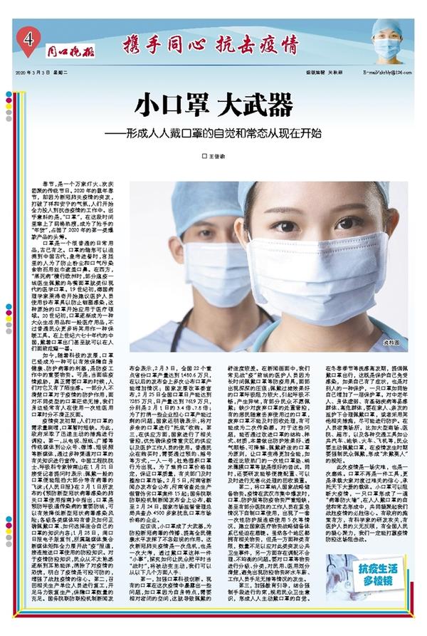 此次疫情是一场灾难,也是一次磨练。口罩不再是一件工具,更是承载大家对渡过难关的信心,承托天下大爱的载体。小口罩可以阻断大疫情,一只口罩形成了一道“病毒防火墙”,在人人戴口罩的自觉和常态形成中,共同凝聚起我们战胜疫情的必胜信心。有政府的施策有方,有科学家的研发攻关,有医护人员的义无反顾,有全国人民的凝心聚力,我们一定能打赢疫情防控这场阻击战。