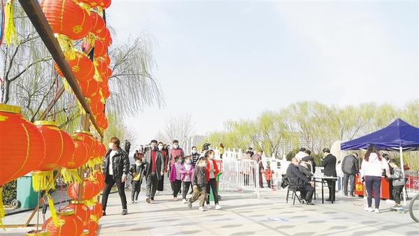记者沿周口公园主干道向里走看到,路旁的花灯鲜艳夺目,如意湖边杨柳依依,园内迎春花开、玉兰飘香,满园春色如期而至。记者发现,游客们三三两两的,主要以家庭为单位一起游玩,没有出现扎堆现象。