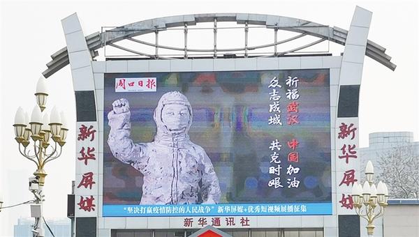 本报讯 近日,由周口日报社融媒体中心精心策划制作的短视频《泥塑群雕:抗击疫情,向英雄致敬!》被新华社采用并推送,先后在北京站、王府井百货大楼和上海陆家嘴华能大厦的“新华屏媒”滚动播出(如图),展示我市抗击疫情的感人画面。