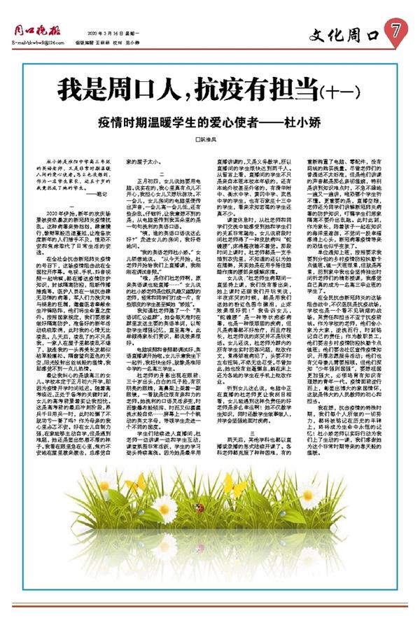 我在想,抗击疫情的特殊时期,我们每个人所做的一切努力,都将被铭记在历史的丰碑上,终将成为生命中永恒的记忆!杜小娇老师以实际行动为我们上了生动的一课,我们感谢她为这个非常时期带来的春天般的温暖。
