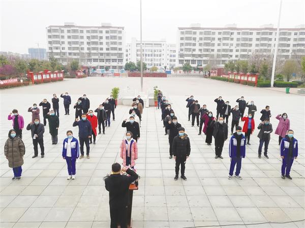 “多难兴邦,道阻且长,行则必至。在最后一百天里,大家要有坚忍不拔的信念,互相加油鼓劲,共克时艰。”当日上午,在郸城县实验中学教学楼前的广场上,鲜艳的五星红旗缓缓升起,线上百日誓师大会在庄严肃穆的国歌声中拉开序幕,该校负责人罗明忠勉励初三学子。