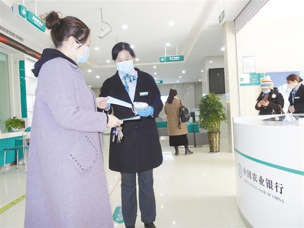自疫情发生以来,农行周口分行要求各营业网点每日营业前统一做好卫生、通风、消毒工作,营业场所每日早、中、晚3次消毒,尤其是对自助交易、柜面交易、客户等候等重点区域以及各类机具设施、便民设施、现金凭证、签字笔等常用物品。图为3月13日农行西城支行员工为前来办理业务的客户发放口罩和小册子。